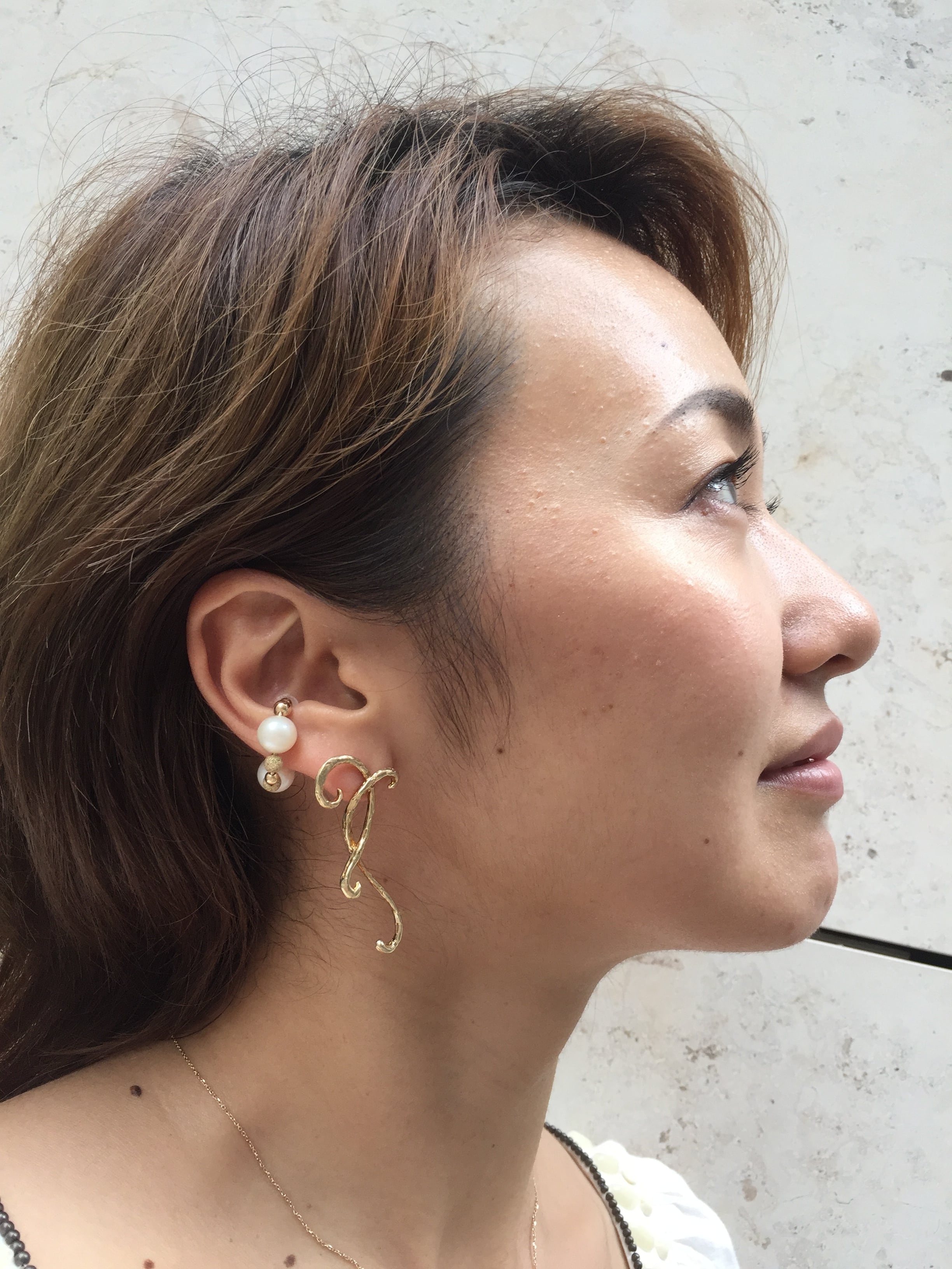 耳たぶから顔の輪郭に沿って付けて頂ける片耳ピアス!反対側の耳には揺れる長めのピアスや、一粒パール、ダイヤのピアスなども相性がいいです。Haruccaのleafシリーズも良く合わせやすいです。